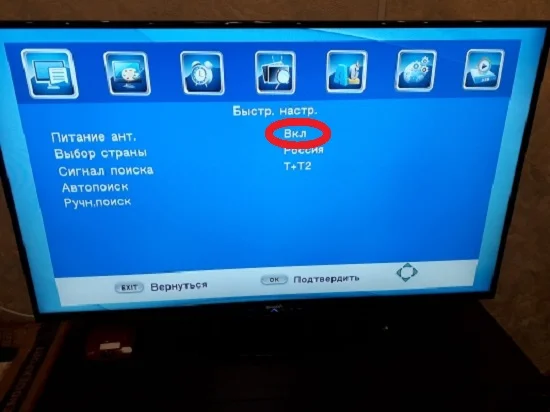 Как включить питание антенны на Т2 приставке (на телевизоре)