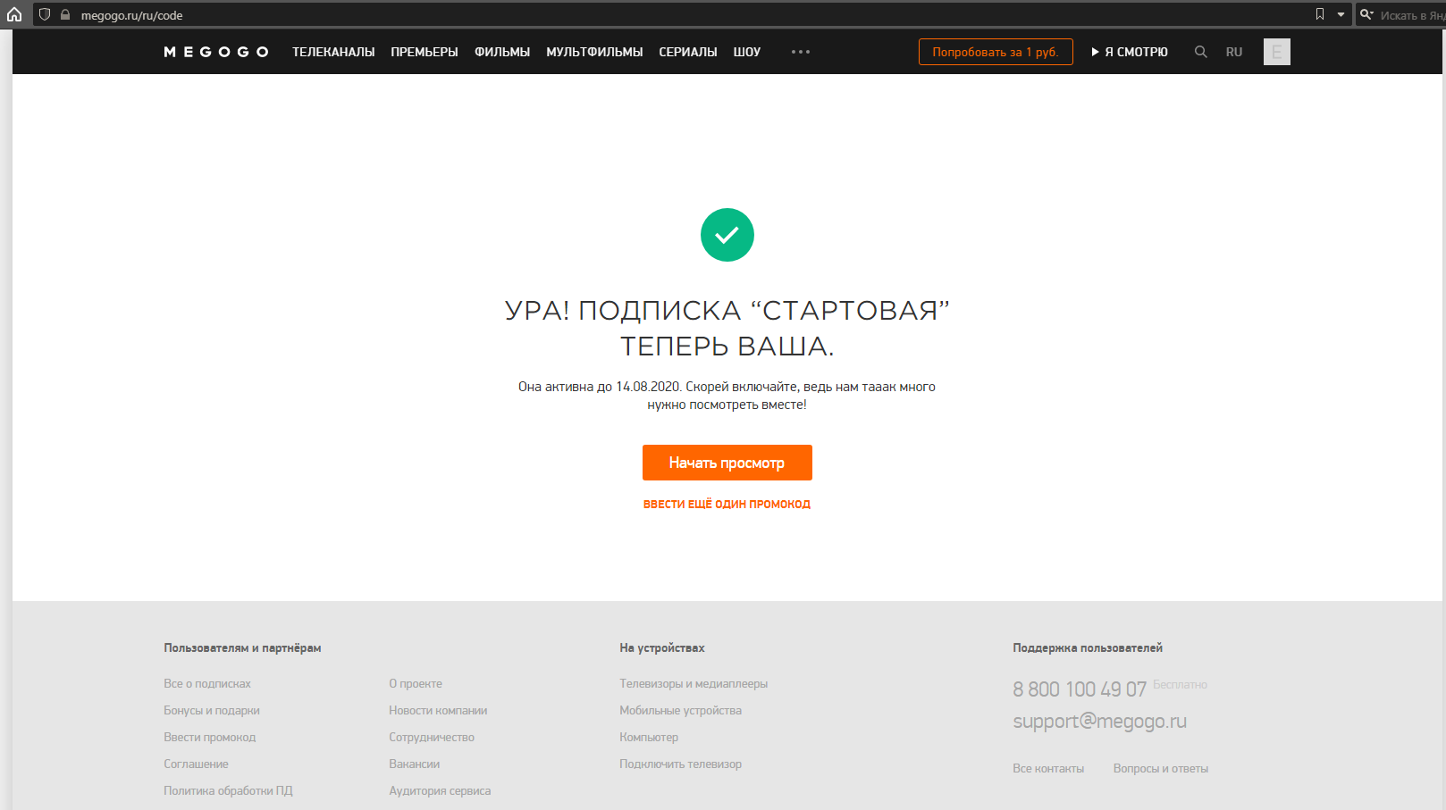 Нажмите кнопку Активировать или эквивалентную кнопку, чтобы активировать ваш промокод на ivi.